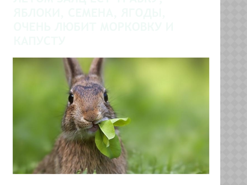 Слайд 5Летом заяц ест травку, яблоки, семена, ягоды, очень любит морковку и