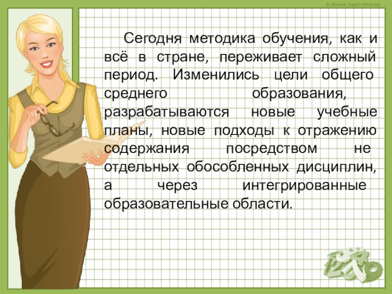 Изменились цели общего среднего образования, разрабатываются новые учебные планы, новые подходы к отражению содержания посредством не отдельных обособленных дисциплин, а через интегрированные образовательные области.