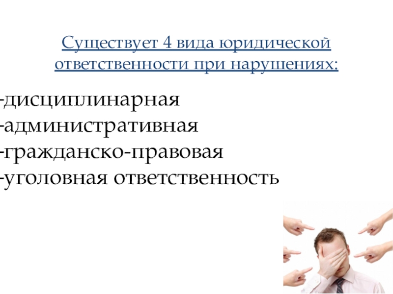 Слайд 8Существует 4 вида юридической ответственности при нарушениях: