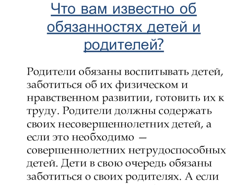 Слайд 30Что вам известно об обязанностях детей и родителей?