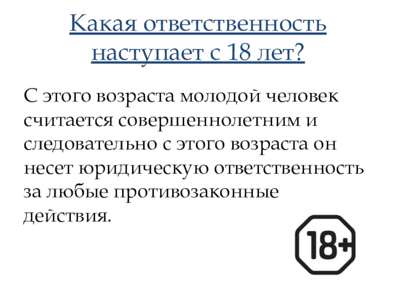 совершеннолетним и следовательно с этого возраста он несет юридическую ответственность за любые противозаконные действия.