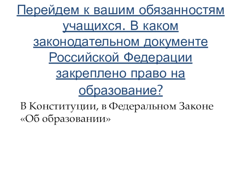 Слайд 21Перейдем к вашим обязанностям учащихся. В каком законодательном документе Российской Федерации