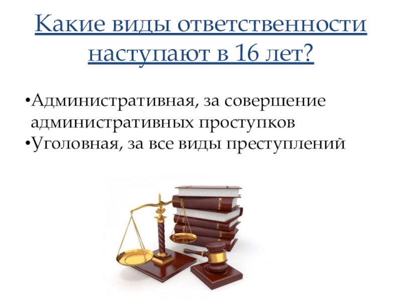 Слайд 13Какие виды ответственности наступают в 16 лет?