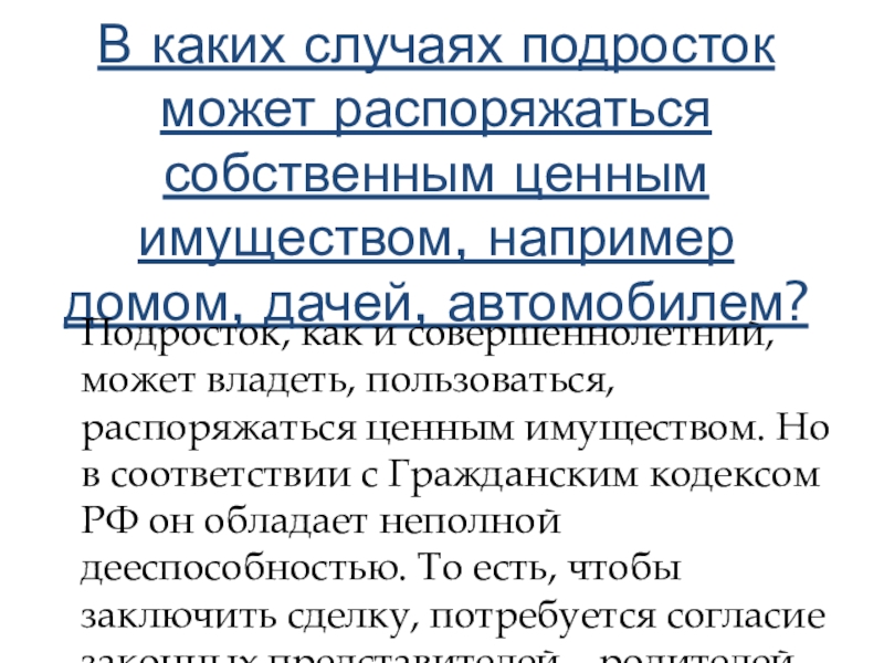 Слайд 29В каких случаях подросток может распоряжаться собственным ценным имуществом, например домом,