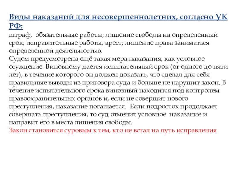 Судом предусмотрена ещё такая мера наказания, как условное осуждение. Виновному дается испытательный срок (от одного до пяти лет), в течение которого он должен доказать, что сделал для себя правильные выводы из приговора суда и больше не нарушит закон. В течение испытательного срока виновный находится под контролем правоохранительных органов и, если не совершит нового преступления, наказание погашается. Если подросток продолжает совершать преступления, то суд отменит условное наказание и направит его в места лишения свободы.