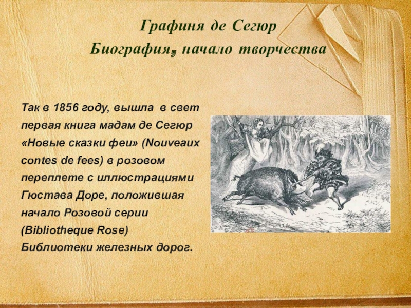 Библиотека должна включать семь серий – кремовая обложка для французской литературы, жёлтая для иностранной, зеленая для рассказов о путешествиях, розовая для детей и т. д. , беда только в том, что в то время во Франции было мало авторов пишущих для детей. И тогда граф де Сегюр предложил Луи Ашетту ознакомиться с рассказами и сказками его жены и если они ему понравятся опубликовать их в Розовой серии.