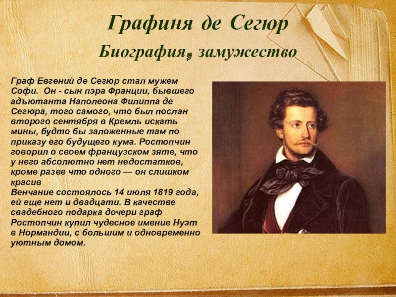- сын пэра Франции, бывшего адъютанта Наполеона Филиппа де Сегюра, того самого, что был послан второго сентября в Кремль искать мины, будто бы заложенные там по приказу его будущего кума. Ростопчин говорил о своем французском зяте, что у него абсолютно нет недостатков, кроме разве что одного — он слишком красив