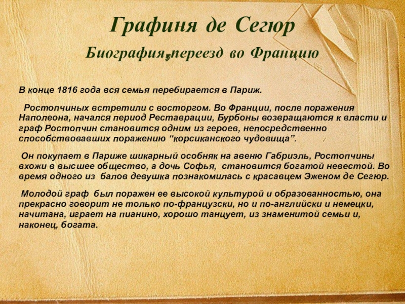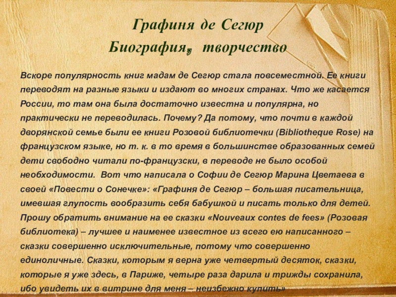 Это ещё одна страничка русской культуры, остававшаяся долго зыкрытой, возможно, только потому, что на всех книгах, написанных ею, стоит высокий титул и девичье имя писательницы, подчеркивающей свое русское происхождение, которое она никогда не скрывала: графиня де Сегюр, урожденная Ростопчина – Сomtesse de Segur, nee Rostopchinе.