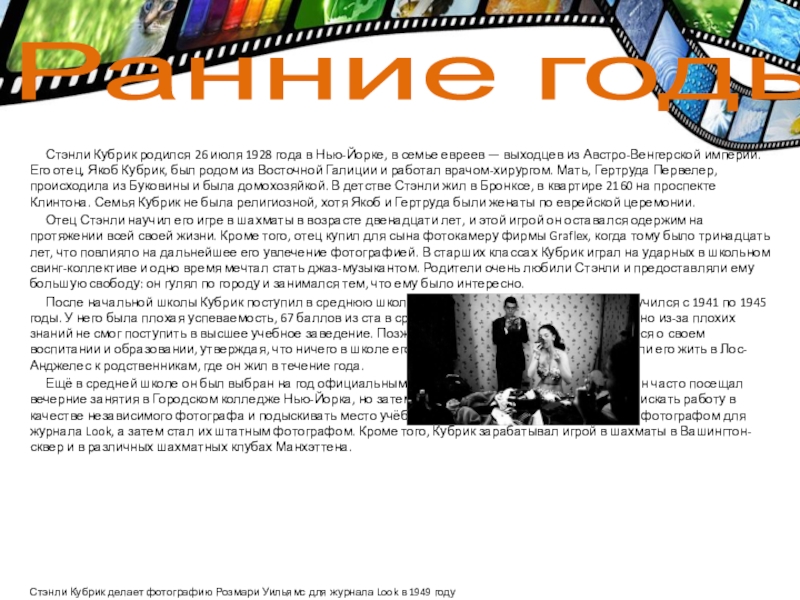 Кубрик помимо фотоискусства увлекался шахматами и часто играл в них на съёмках со съемочной группой.