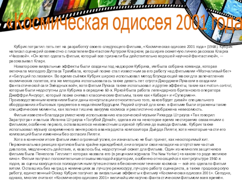 фильма, «Космическая одиссея 2001 года» (1968). Кубрик написал сценарий совместно с писателем-фантастом Артуром Кларком, расширив сюжетную линию рассказа Кларка «Часовой». «Он хотел сделать фильм, который все признали бы действительно хорошей научной фантастикой», — рассказывал Кларк.