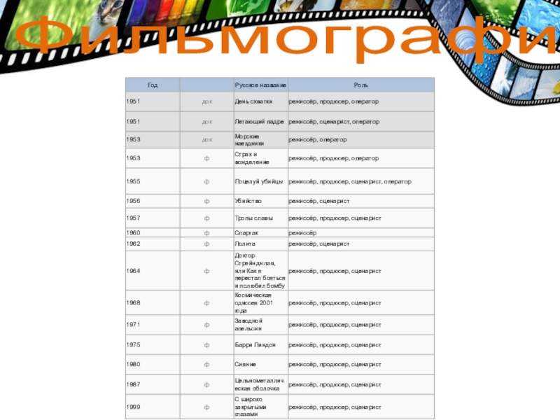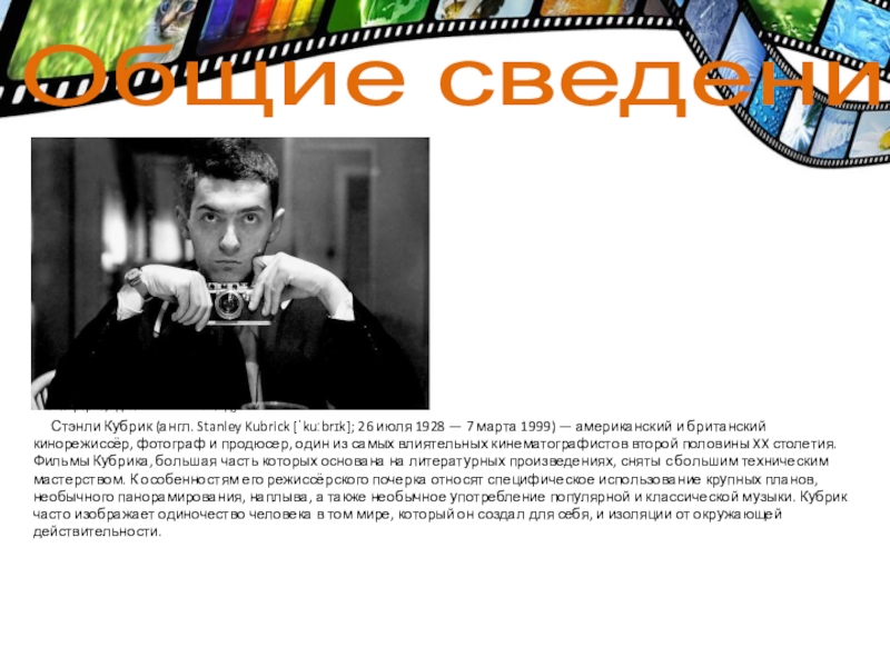 26 июля 1928 — 7 марта 1999) — американский и британский кинорежиссёр, фотограф и продюсер, один из самых влиятельных кинематографистов второй половины XX столетия. Фильмы Кубрика, большая часть которых основана на литературных произведениях, сняты с большим техническим мастерством. К особенностям его режиссёрского почерка относят специфическое использование крупных планов, необычного панорамирования, наплыва, а также необычное употребление популярной и классической музыки. Кубрик часто изображает одиночество человека в том мире, который он создал для себя, и изоляции от окружающей действительности.