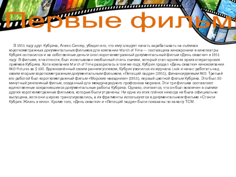 ему следует начать зарабатывать на съёмках короткометражных документальных фильмов для компании March of Time — поставщика кинохроники в кинотеатры. Кубрик согласился и на собственные деньги снял короткометражный документальный фильм «День схватки» в 1951 году. В фильме, в частности, был использован необычный стиль съемки, который стал одним из ярких операторских приёмов Кубрика. Хотя компания March of Time разорилась в том же году, Кубрик продал «День схватки» кинокомпании RKO Pictures за $ 100. Вдохновлённый своим ранним успехом, Кубрик уволился из журнала Look и начал работать над своим вторым короткометражным документальным фильмом, «Летящий падре» (1951), финансируемым RKO. Третьей его работой был короткометражный фильм «Морские наездники» (1953), первый цветной фильм Кубрика. Это был 30-минутный рекламный фильм, созданный для международного профсоюза моряков. Эти три фильма составляют единственные сохранившиеся документальные работы Кубрика. Однако, считается, что он был вовлечен в съёмки других короткометражных фильмов, которые были утрачены. Ни одна из этих плёнок никогда не была официально выпущена, хотя они широко транслировались, а их фрагменты используются в документальном фильме «Стэнли Кубрик: Жизнь в кино». Кроме того, «День схватки» и «Летящий падре» были показаны по каналу ТСМ.