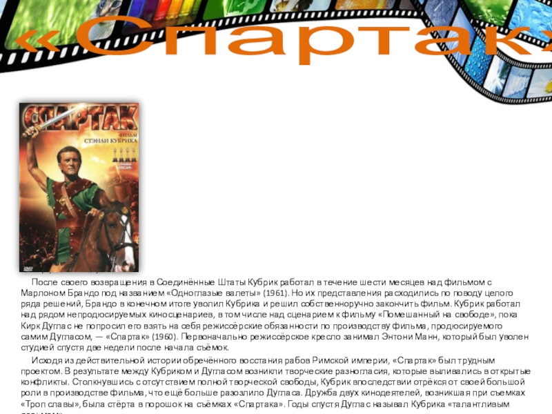течение шести месяцев над фильмом с Марлоном Брандо под названием «Одноглазые валеты» (1961). Но их представления расходились по поводу целого ряда решений, Брандо в конечном итоге уволил Кубрика и решил собственноручно закончить фильм. Кубрик работал над рядом непродюсируемых киносценариев, в том числе над сценарием к фильму «Помешанный на свободе», пока Кирк Дуглас не попросил его взять на себя режиссёрские обязанности по производству фильма, продюсируемого самим Дугласом, — «Спартак» (1960). Первоначально режиссёрское кресло занимал Энтони Манн, который был уволен студией спустя две недели после начала съёмок.