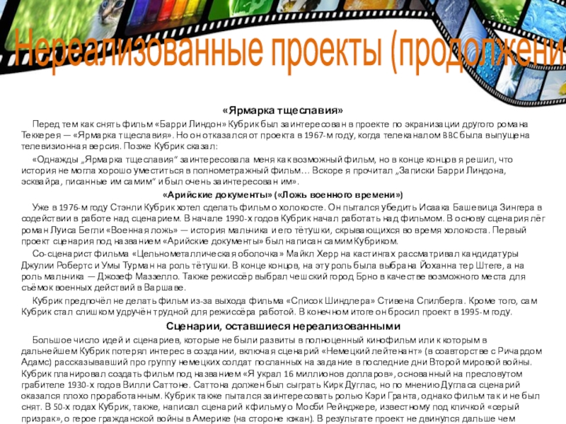 был заинтересован в проекте по экранизации другого романа Теккерея — «Ярмарка тщеславия». Но он отказался от проекта в 1967-м году, когда телеканалом BBC была выпущена телевизионная версия. Позже Кубрик сказал: