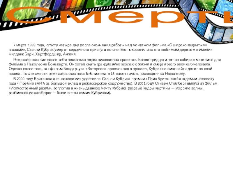 монтажом фильма «С широко закрытыми глазами», Стэнли Кубрик умер от сердечного приступа во сне. Его похоронили за его любимым деревом в имении Чилдвик Бэри, Хартфордшир, Англия.