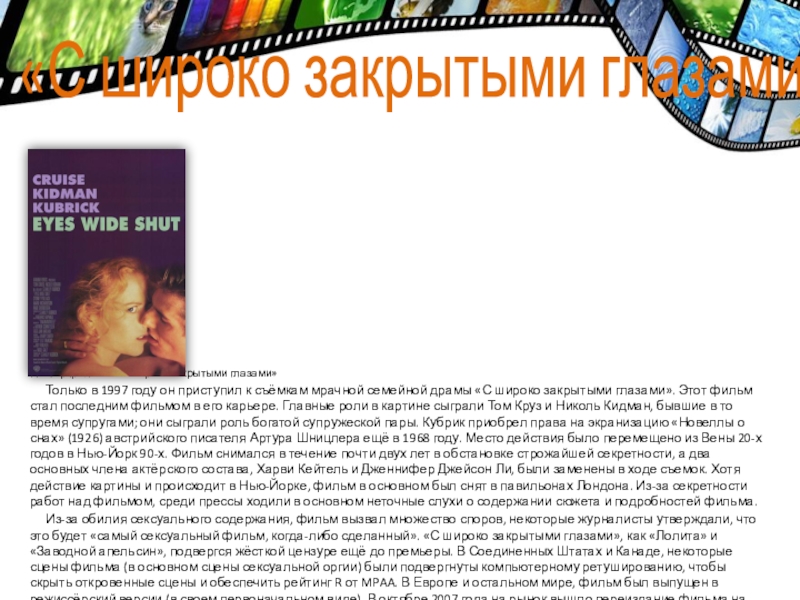 году он приступил к съёмкам мрачной семейной драмы «С широко закрытыми глазами». Этот фильм стал последним фильмом в его карьере. Главные роли в картине сыграли Том Круз и Николь Кидман, бывшие в то время супругами; они сыграли роль богатой супружеской пары. Кубрик приобрел права на экранизацию «Новеллы о снах» (1926) австрийского писателя Артура Шницлера ещё в 1968 году. Место действия было перемещено из Вены 20-х годов в Нью-Йорк 90-х. Фильм снимался в течение почти двух лет в обстановке строжайшей секретности, а два основных члена актёрского состава, Харви Кейтель и Дженнифер Джейсон Ли, были заменены в ходе съемок. Хотя действие картины и происходит в Нью-Йорке, фильм в основном был снят в павильонах Лондона. Из-за секретности работ над фильмом, среди прессы ходили в основном неточные слухи о содержании сюжета и подробностей фильма.