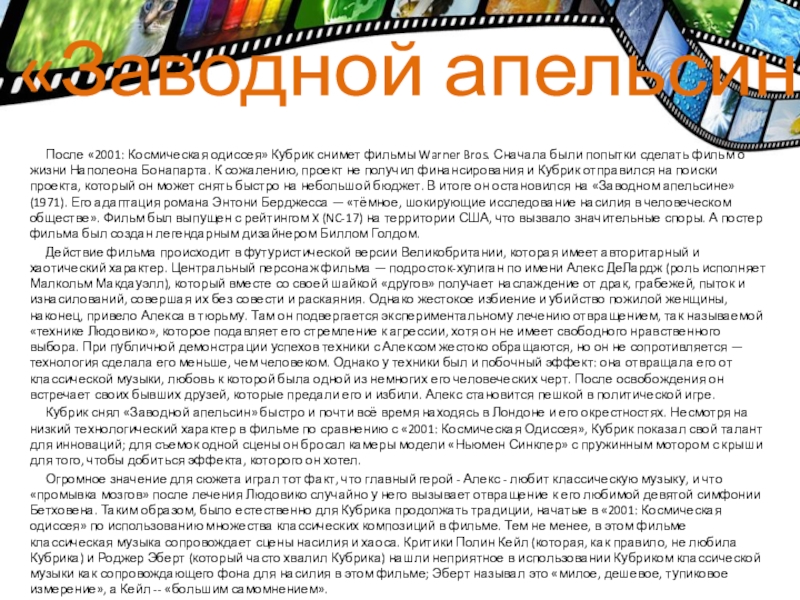 были попытки сделать фильм о жизни Наполеона Бонапарта. К сожалению, проект не получил финансирования и Кубрик отправился на поиски проекта, который он может снять быстро на небольшой бюджет. В итоге он остановился на «Заводном апельсине» (1971). Его адаптация романа Энтони Берджесса — «тёмное, шокирующие исследование насилия в человеческом обществе». Фильм был выпущен с рейтингом X (NC-17) на территории США, что вызвало значительные споры. А постер фильма был создан легендарным дизайнером Биллом Голдом.