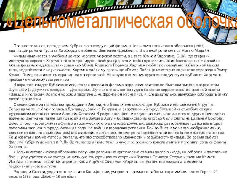 Прошло семь лет, прежде чем Кубрик снял следующий фильм. «Цельнометаллическая