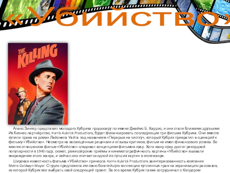 Б. Харрис, и они стали близкими друзьями. Их бизнес-партнёрство, Harris-Kubrick Productions, будет финансировать последующие три фильма Кубрика. Они вместе купили права на роман Лайонела Уайта под названием «Перерыв на чистку», который Кубрик превратил в сценарий к фильму «Убийство». Несмотря на восхищённые рецензии и отзывы критиков, фильм не имел финансового успеха. Во многих отношениях фильм «Убийство» следовал концепциям фильмов нуар. Хотя жанр нуар достиг рекордной популярности в 1940 году, сюжет, режиссёрские приёмы и кинематографичность картины «Убийство» вызвали возрождение этого жанра, и сейчас оно считается одной из лучших картин в этом жанре.