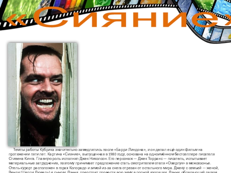 он делал ещё один фильм на протяжении пяти лет. Картина «Сияние», выпущенная в 1980 году, основана на одноимённом бестселлере писателя Стивена Кинга. Главную роль исполнил Джек Николсон. Его персонаж — Джек Торранс — писатель, испытывает материальные затруднения, поэтому принимает предложение стать смотрителем отеля «Оверлук» в межсезонье. Отель-курорт расположен в горах Колорадо и зимой из-за снега отрезан от остального мира. Джеку с семьей — женой, Венди (Шелли Дюваль) и сыном, Дэнни, предстоит провести всю зиму в полной изоляции. Дэнни, обладающий даром видения — «сиянием», обнаруживает в отеле «гостей» — призраков, населяющих это место, бывшее когда-то индейским кладбищем. Отель открывает всё более ужасные образы не только для Дэнни: его отец медленно сходит с ума.