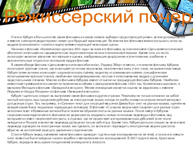 существующий роман, затем договаривался и вместе с автором редактировал сюжет для будущей экранизации. Во многих его фильмах можно услышать голос за кадром (в основном от главного героя) комментирующий некоторые сцены.