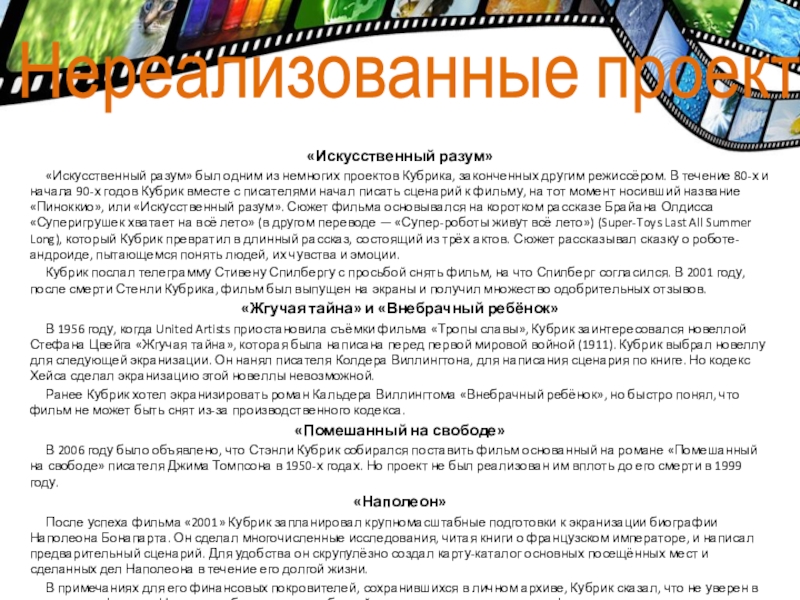 другим режиссёром. В течение 80-х и начала 90-х годов Кубрик вместе с писателями начал писать сценарий к фильму, на тот момент носивший название «Пиноккио», или «Искусственный разум». Сюжет фильма основывался на коротком рассказе Брайана Олдисса «Суперигрушек хватает на всё лето» (в другом переводе — «Супер-роботы живут всё лето») (Super-Toys Last All Summer Long), который Кубрик превратил в длинный рассказ, состоящий из трёх актов. Сюжет рассказывал сказку о роботе-андроиде, пытающемся понять людей, их чувства и эмоции.
