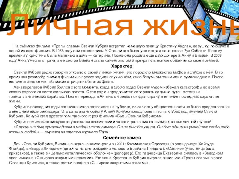 Стэнли Кубрик редко говорил открыто о своей личной жизни, это породило множество мифов и слухов о нём. В то время как режиссёр снимал фильмы, в прессе ходили слухи о нём, как о безумном гении или о сумасшедшем. После его смерти его семья и близкие отрицали оба этих факта.