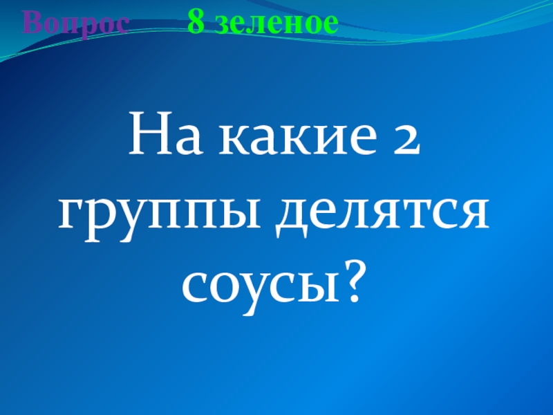 8 зеленоеВопрос На какие 2 группы делятся соусы?