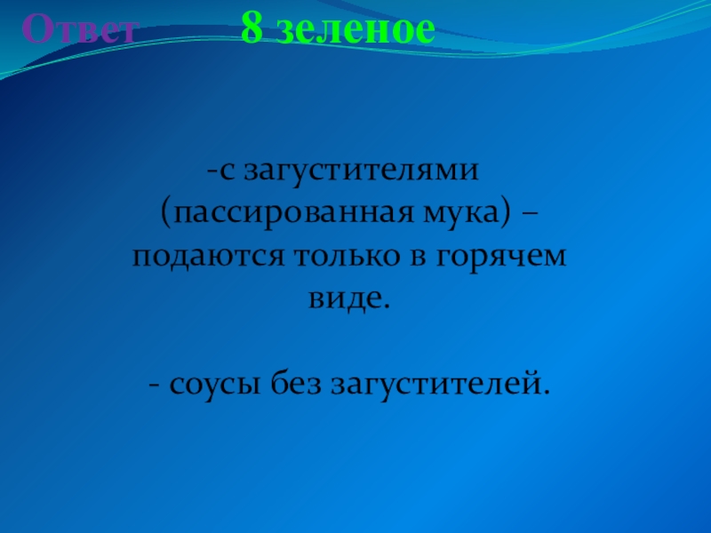 8 зеленоеОтветс загустителями (пассированная мука) – подаются только в горячем виде.- соусы без загустителей.