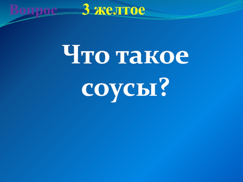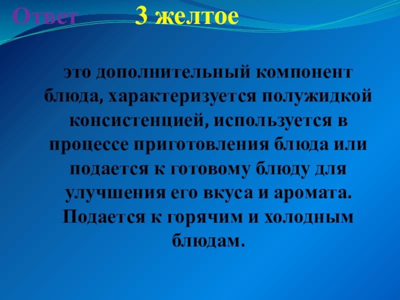 3 желтоеОтветэто дополнительный компонент блюда, характеризуется полужидкой консистенцией, используется в процессе приготовления блюда или подается к готовому