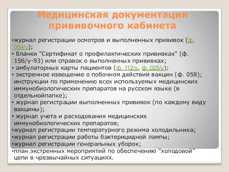 Медицинская документация прививочного кабинетажурнал регистрации осмотров и выполненных прививок (ф. 064/у); бланки