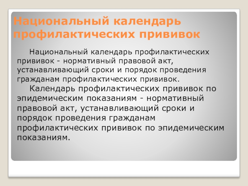 Национальный календарь профилактических прививок	Национальный календарь профилактических прививок - нормативный правовой акт, устанавливающий сроки и порядок проведения гражданам