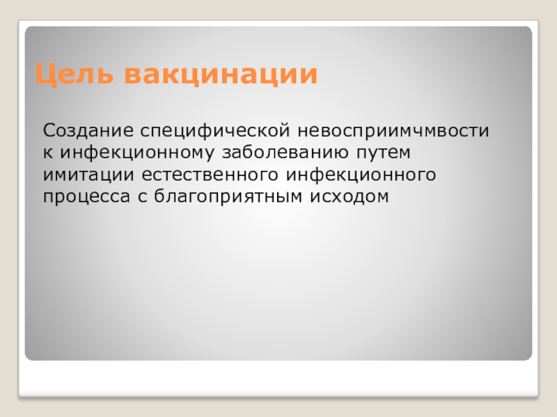 Цель вакцинацииСоздание специфической невосприимчмвости к инфекционному заболеванию путем имитации естественного инфекционного процесса с благоприятным исходом