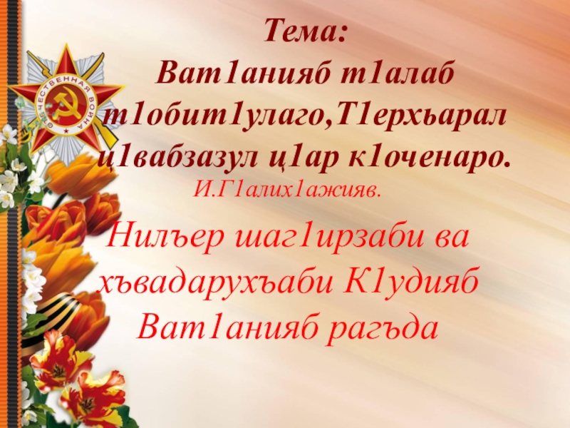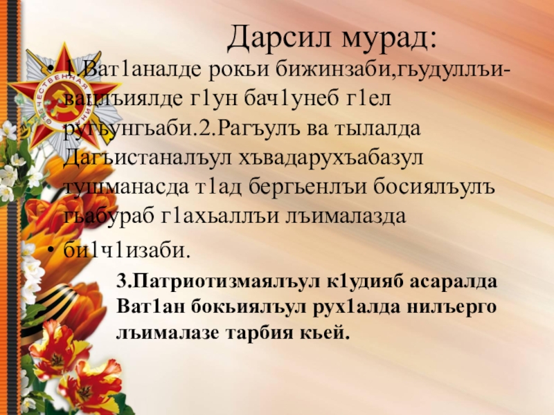 3.Патриотизмаялъул к1удияб асаралда Ват1ан бокьиялъул рух1алда нилъерго лъималазе тарбия кьей.