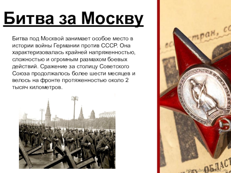 Германии против СССР. Она характеризовалась крайней напряженностью, сложностью и огромным размахом боевых действий. Сражение за столицу Советского Союза продолжалось более шести месяцев и велось на фронте протяженностью около 2 тысяч километров.