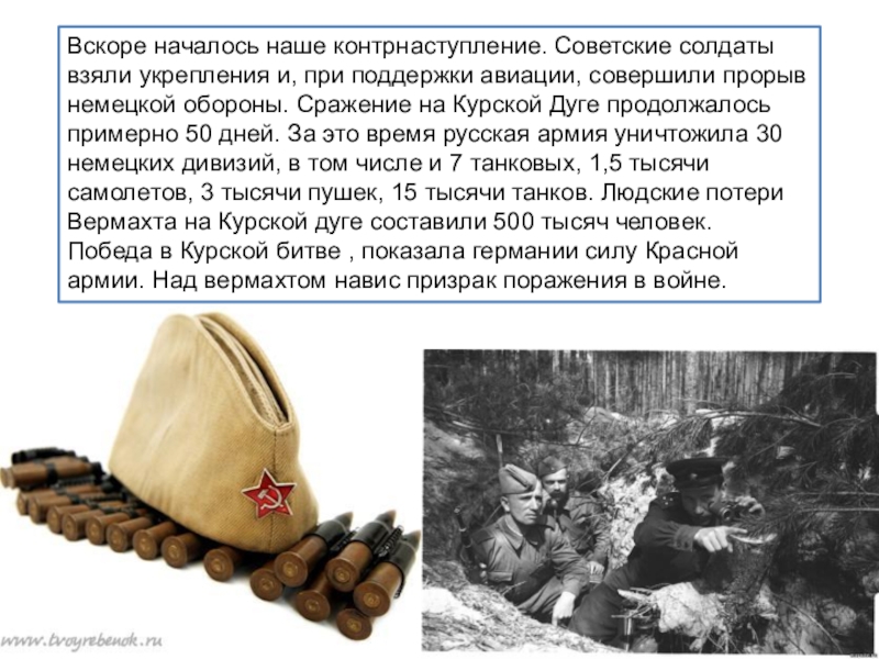 Слайд 22Вскоре началось наше контрнаступление. Советские солдаты взяли укрепления и, при поддержки