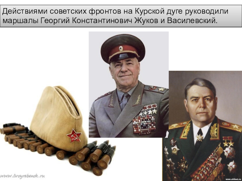 Слайд 20Действиями советских фронтов на Курской дуге руководили маршалы Георгий Константинович Жуков и Василевский.