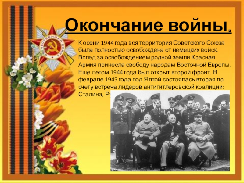 полностью освобождена от немецких войск. Вслед за освобождением родной земли Красная Армия принесла свободу народам Восточной Европы. Еще летом 1944 года был открыт второй фронт. В феврале 1945 года под Ялтой состоялась вторая по счету встреча лидеров антигитлеровской коалиции: Сталина, Рузвельта и Черчилля.