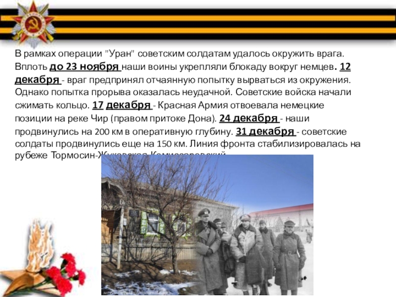 Слайд 17В рамках операции "Уран" советским солдатам удалось окружить врага. Вплоть до