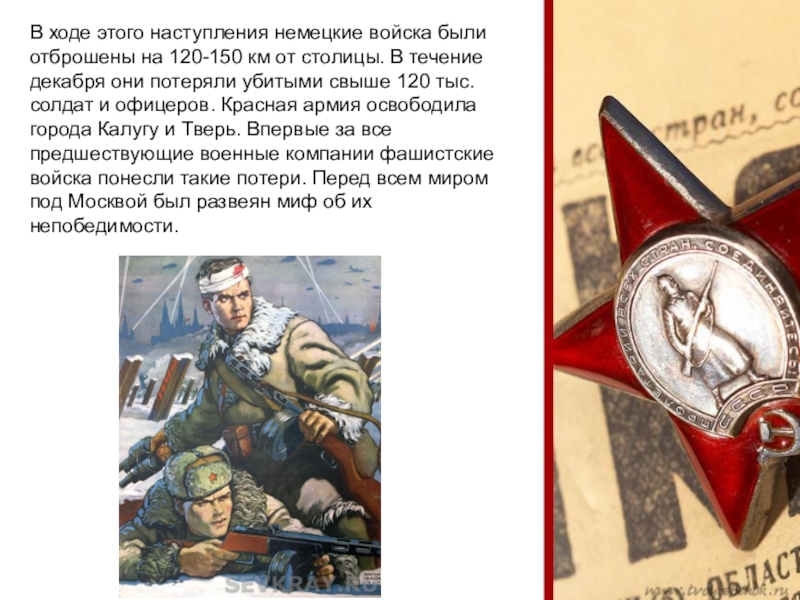 от столицы. В течение декабря они потеряли убитыми свыше 120 тыс. солдат и офицеров. Красная армия освободила города Калугу и Тверь. Впервые за все предшествующие военные компании фашистские войска понесли такие потери. Перед всем миром под Москвой был развеян миф об их непобедимости.