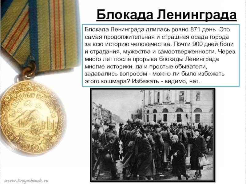 Слайд 5Блокада Ленинграда длилась ровно 871 день. Это самая продолжительная и страшная