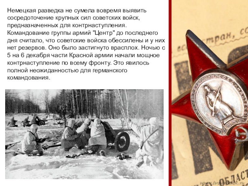 предназначенных для контрнаступления. Командование группы армий "Центр" до последнего дня считало, что советские войска обессилены и у них нет резервов. Оно было застигнуто врасплох. Ночью с 5 на 6 декабря части Красной армии начали мощное контрнаступление по всему фронту. Это явилось полной неожиданностью для германского командования.