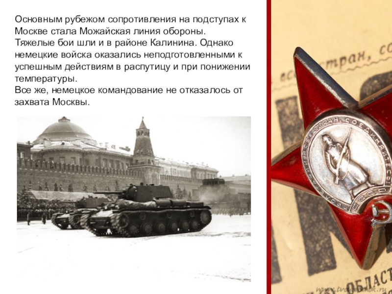 Слайд 9Основным рубежом сопротивления на подступах к Москве стала Можайская линия обороны.
