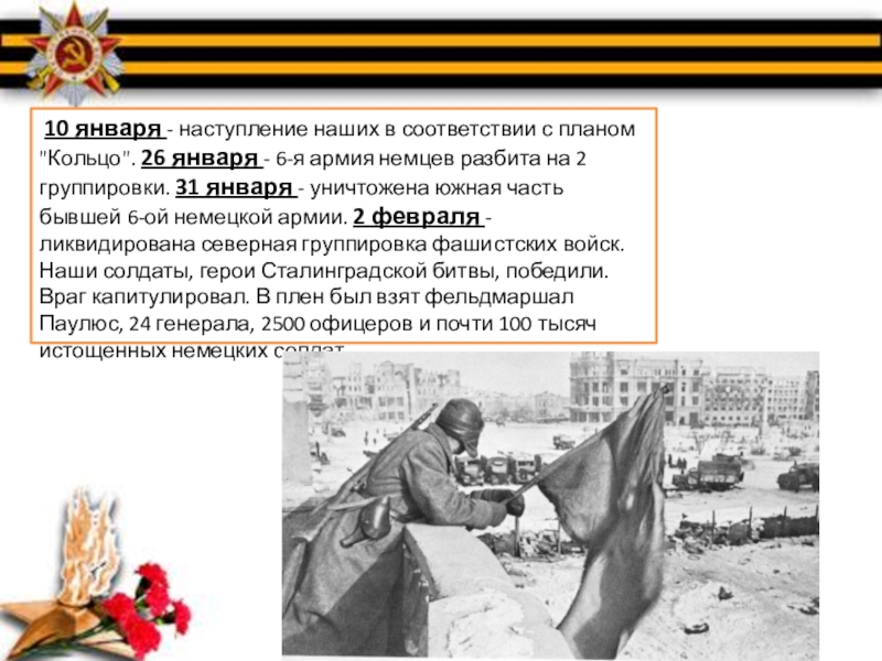26 января - 6-я армия немцев разбита на 2 группировки. 31 января - уничтожена южная часть бывшей 6-ой немецкой армии. 2 февраля - ликвидирована северная группировка фашистских войск. Наши солдаты, герои Сталинградской битвы, победили. Враг капитулировал. В плен был взят фельдмаршал Паулюс, 24 генерала, 2500 офицеров и почти 100 тысяч истощенных немецких солдат.
