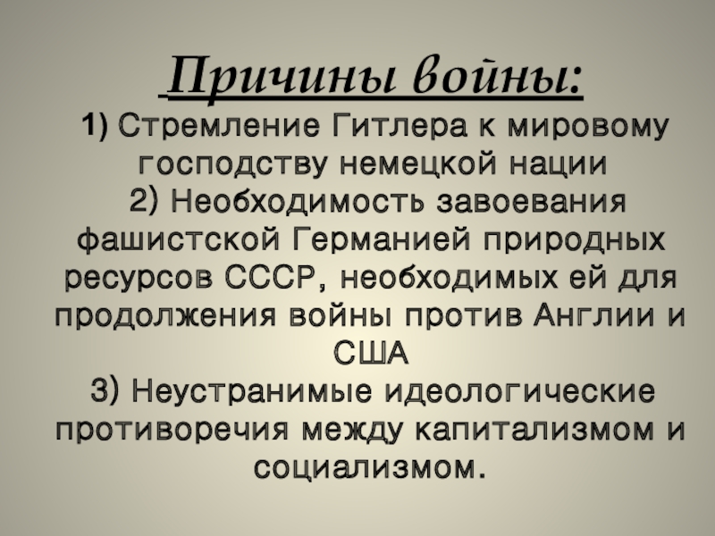 2) Необходимость завоевания фашистской Германией природных ресурсов СССР, необходимых ей для продолжения войны против Англии и США