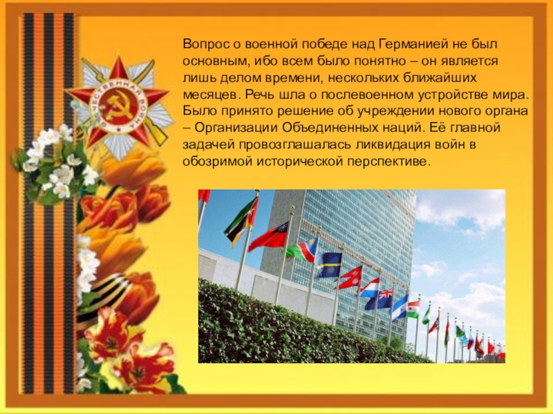 – он является лишь делом времени, нескольких ближайших месяцев. Речь шла о послевоенном устройстве мира. Было принято решение об учреждении нового органа – Организации Объединенных наций. Её главной задачей провозглашалась ликвидация войн в обозримой исторической перспективе.