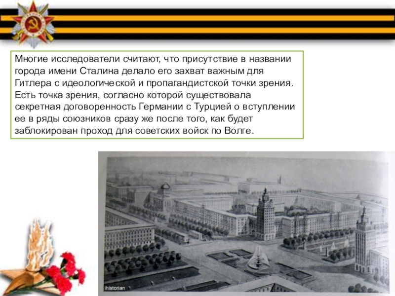 Слайд 14Многие исследователи считают, что присутствие в названии города имени Сталина делало