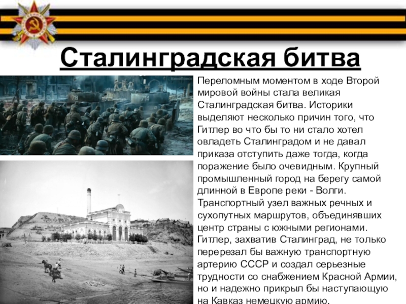 битва. Историки выделяют несколько причин того, что Гитлер во что бы то ни стало хотел овладеть Сталинградом и не давал приказа отступить даже тогда, когда поражение было очевидным. Крупный промышленный город на берегу самой длинной в Европе реки - Волги. Транспортный узел важных речных и сухопутных маршрутов, объединявших центр страны с южными регионами. Гитлер, захватив Сталинград, не только перерезал бы важную транспортную артерию СССР и создал серьезные трудности со снабжением Красной Армии, но и надежно прикрыл бы наступающую на Кавказ немецкую армию.