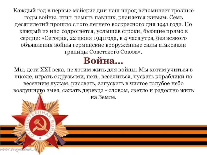 войны, чтит память павших, кланяется живым. Семь десятилетий прошло с того летнего воскресного дня 1941 года. Но каждый из нас содрогается, услышав строки, бьющие прямо в сердце: «Сегодня, 22 июня 1941года, в 4 часа утра, без всякого объявления войны германские вооружённые силы атаковали границы Советского Союза».