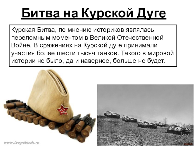 в Великой Отечественной Войне. В сражениях на Курской дуге принимали участия более шести тысяч танков. Такого в мировой истории не было, да и наверное, больше не будет.